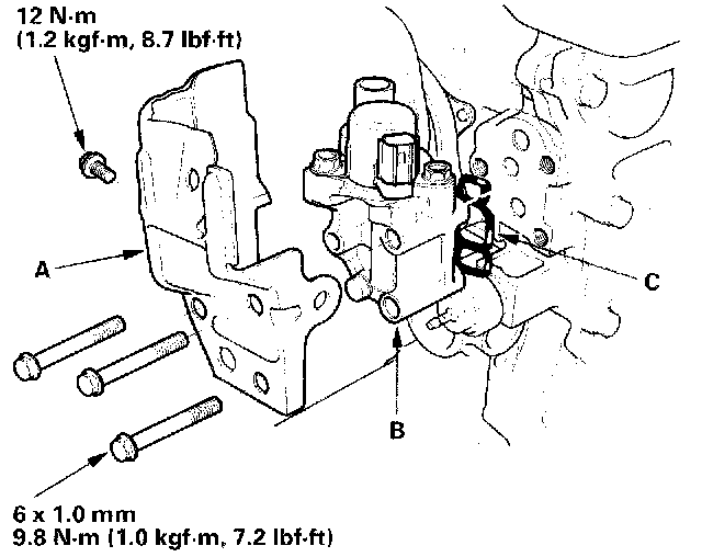 3. If the resistance is within specifications, remove the cover (A), then remove the VTEC solenoid valve assembly (B) from the cylinder head, and check the VTEC solenoid valve filter (C) for clogging. If it is clogged, replace the solenoid valve filter, the engine oil filter, and the engine oil.
