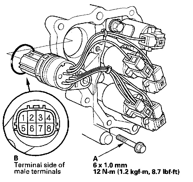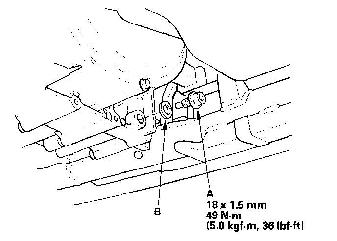 7. Remove the bolt (A), and remove the shift solenoid harness connector (B).