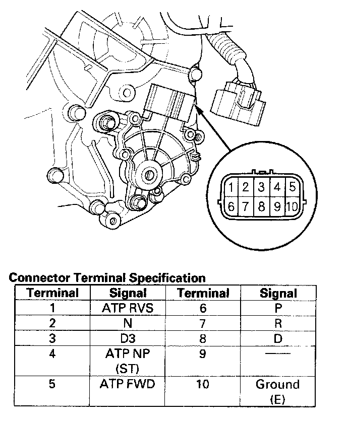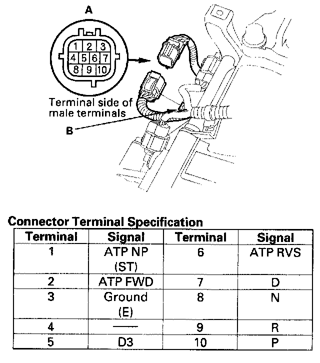 Transmission Range Switch Test1. Remove the transmission range switch harness connector (A) from the connector bracket (B), then disconnect the connector.