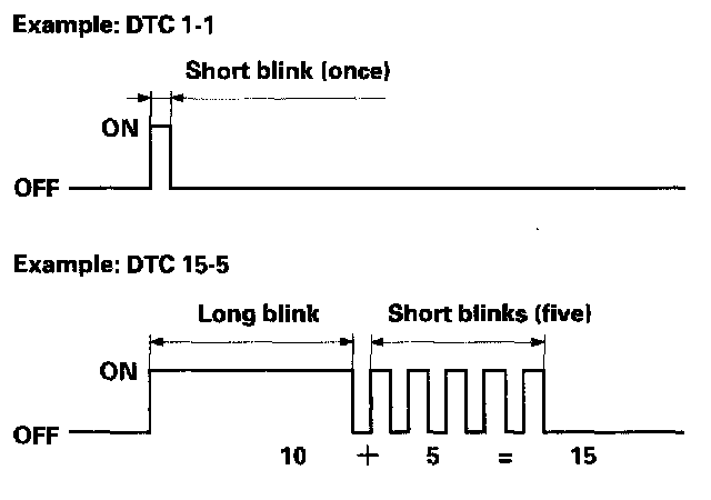 2. Turn the ignition switch ON (II), from the SELECT MODE MENU select SCS mode, then observe the D indicator in the gauge assembly. Code 1 through 9 are indicated by individual short blinks. Code 10 and above are indicated by a series of long and short blinks. One long blink equals 10 short blinks. Add the long and short blinks together to determine the code.