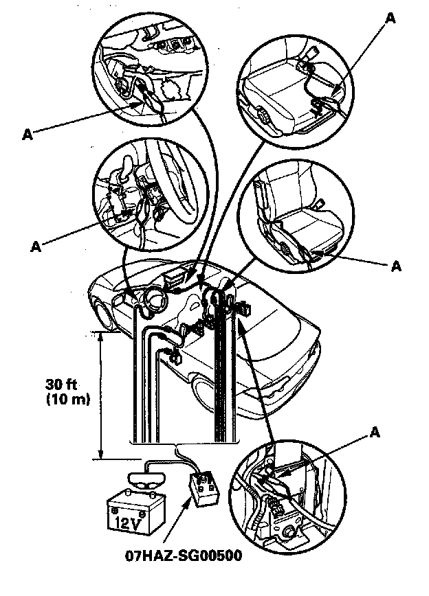 9. Cut off each connector, strip the ends of the wires, and connect the deployment tool alligator clips (A) to the wires. Place the deployment tool at least 30 feet (10 meters) away from the vehicle.
