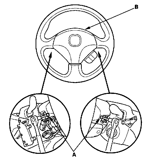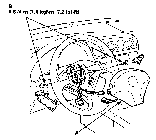 1. Place the new driver's airbag (A) in the steering wheel, and secure it with new Torx bolts (B).