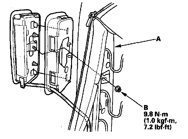 1. Place the new side airbag on the seat-back frame (A). Tighten the side airbag mounting nut (B).