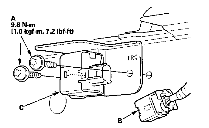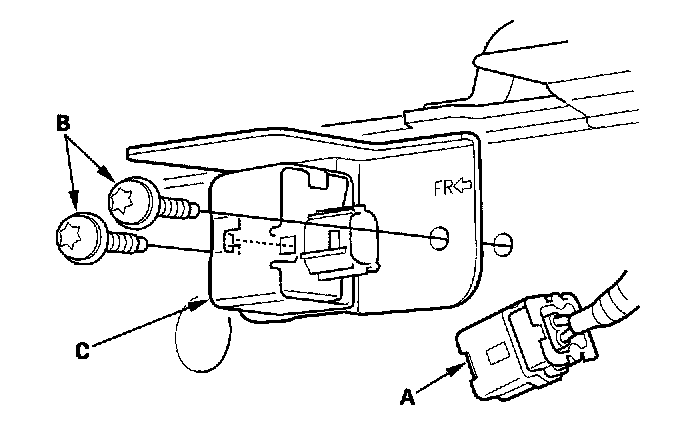 1. Install the new front impact sensor with new Torx bolts (A), then connect the engine compartment wire harness 2P connector (B) to the front impact sensor (C).