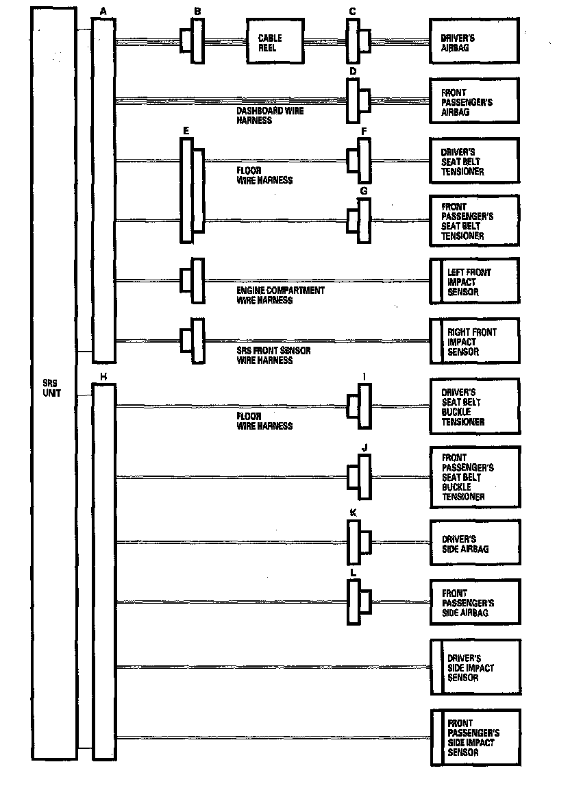 - Before disconnecting the floor wire harness 18P connector (H) from the SRS unit, disconnect both side airbag 2P connectors (K, L) and both seat belt buckle tensioner 4P connectors (I, J).