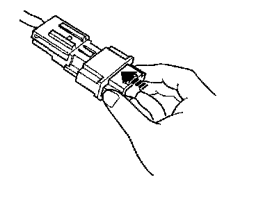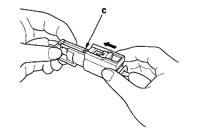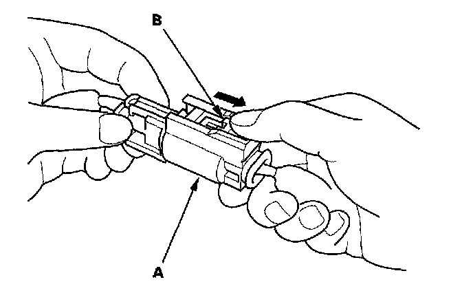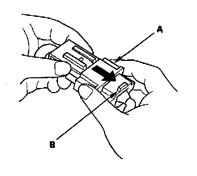 1. To reconnect, hold the pawl-side connector, and press on the back of the sleeve-side connector in the direction shown. As the 2 connector halves are pressed together, the sleeve (A) is pushed back by the pawl (C). Do not touch the sleeve.
