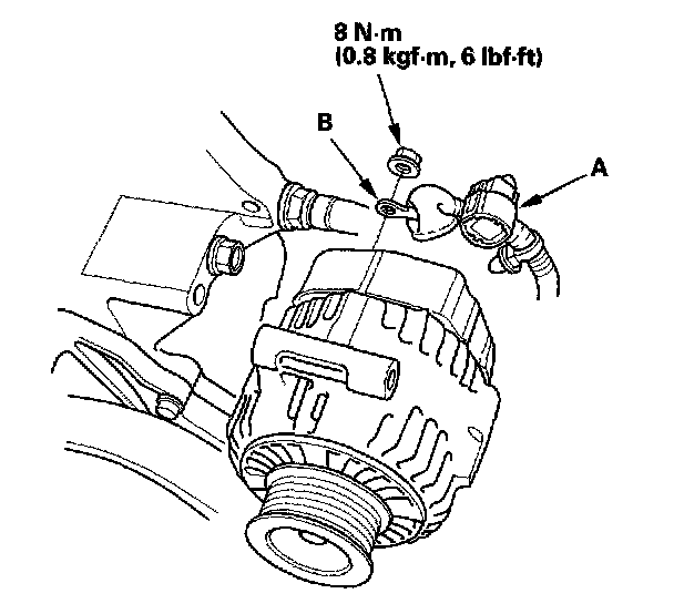 6. Disconnect the alternator connector (A) and BLK wire (B) from the alternator.