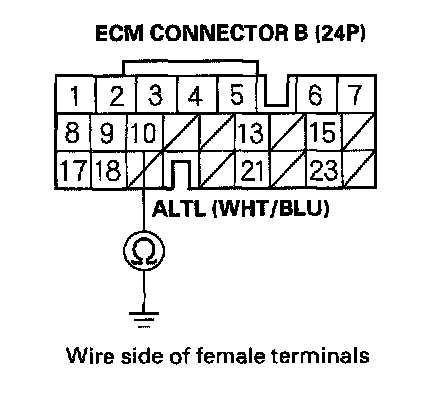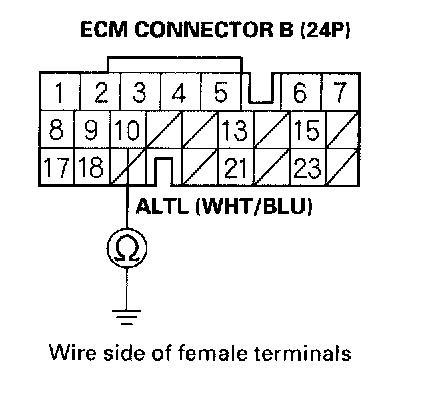 10. Check for continuity between ECM connector terminal B10 and body ground.