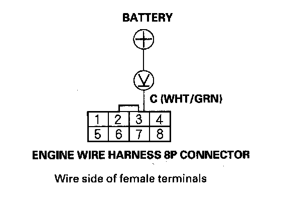 5. Measure the voltage between engine wire harness 8P connector terminal No. 3 and the positive terminal of the battery.