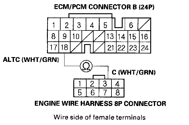 11. Check for continuity between ECM/PCM connector terminal B18 and the engine wire harness 8P connector terminal No. 3.