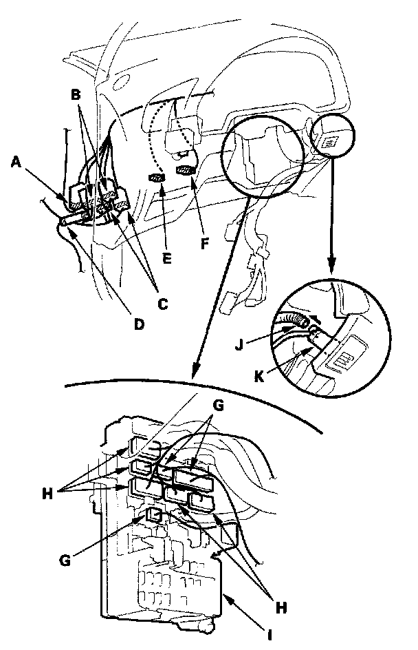 7. From under the dash, disconnect the interior wire harness connector (A), driver's door wire harness connectors (B), wiper subwire harness connectors (C), antenna lead (D), clutch pedal position switch connector (E) (on M/T model), and brake pedal position switch connector (F), and disconnect the floor wire harness connectors (G) and engine compartment wire harness connectors (H) from the under-dash fuse/relay box (I).