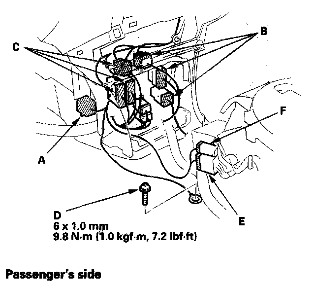 9. From the driver's side, disconnect the SRS control unit connector (A), floor wire harness connectors (B), and engine compartment wire harness connectors (C), and using a T30 Torx hit, remove the ground bolt (D). On the A/T model, disconnect the parking pin shift connector (E) and shift lock solenoid connector (F).