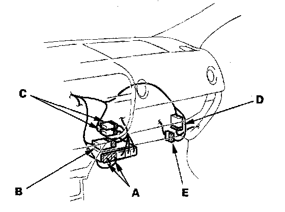10. From under the dash, disconnect the ECM/PCM connectors (A), engine wire harness connector (B), A/C subharness connectors (C), passenger's door wire harness connector (D), and front sensor wire harness connector (E).