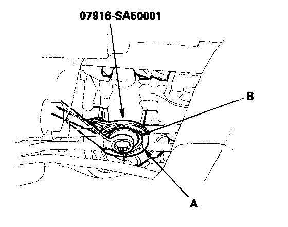 6. Loosen the rack guide screw locknut (A) with the special tool, then remove the rack guide screw (B).