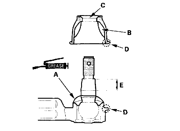 ^ Keep grease off the boot mounting area (D) and the tapered section (E) of the ball pin.