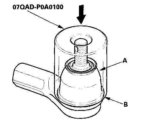 4. Install the new boot (A) using the special tool. The boot must not have a gap at the boot installation sections (B). After installing the boot, check the ball pin tapered section for grease contamination, and wise it. if necessary.