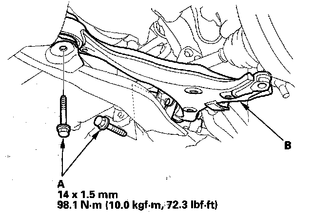5. Remove the flange bolts (A), and remove the lower arm (B).