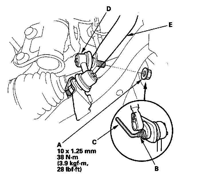 2. Remove the self-locking nuts (A) while holding the joint pin (B) with a hex wrench (C), and disconnect the stabilizer links (D) from the stabilizer bar (E) on the right and left.