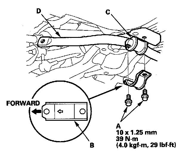 3. Remove the flange bolts (A) and bushing holders (B), then remove the bushings (C) and the stabilizer bar (D).