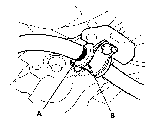 ^ Align the ends of the paint marks (A) on the stabilizer bar with each end of the bushings (B).