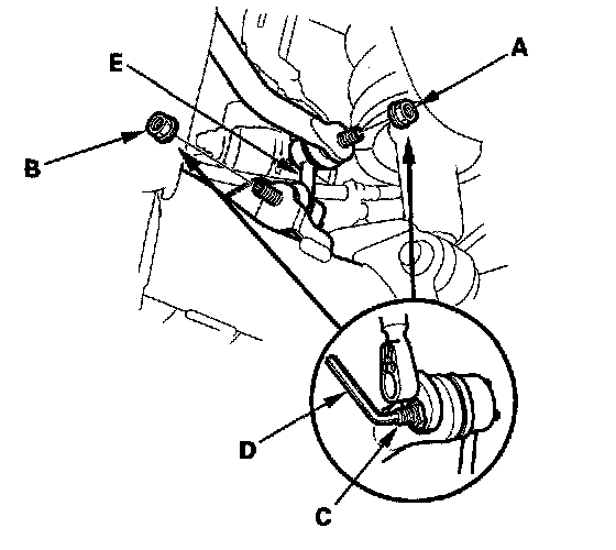 2. Remove the self-locking nut (A) and flange nut (B) while holding the respective joint pin (C) with a hex wrench (D), then remove the stabilizer link (E).