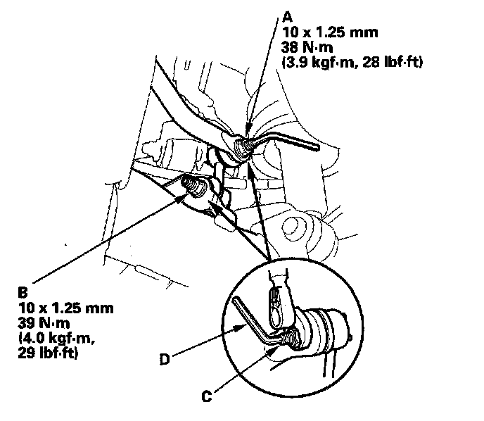 6. Tighten the new self-locking nut (A) and flange nut (B) to the specified torque values while holding the respective joint pins (C) with a hex wrench (D).