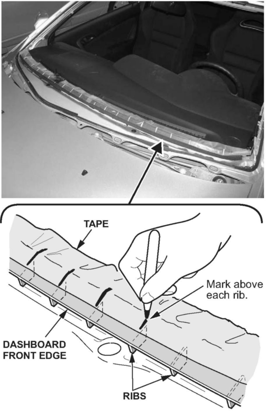 3. Apply a piece of masking tape across the top of the dashboard just in front of the defroster vent. Slightly lift up on the dashboard, and feel the underside to locate each rib. Using a felt-tip marker, mark the masking tape where each rib is located.