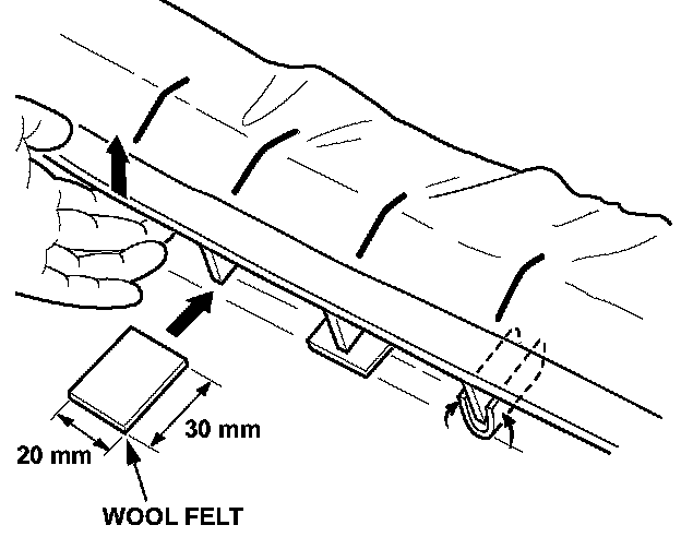 4. Remove the backing paper from one piece of wool felt. Stick the edge of the piece of wool felt to your thumb. Using the mark on the tape as a reference point, slightly pull up on the instrument panel with your other hand, and slide the felt under the leading edge of the rib. Make sure the felt goes between the rubber mat and the rib. Center the piece of felt on the rib, then fold the felt piece over the sides of the rib. Make sure the felt sticks firmly to the rib.