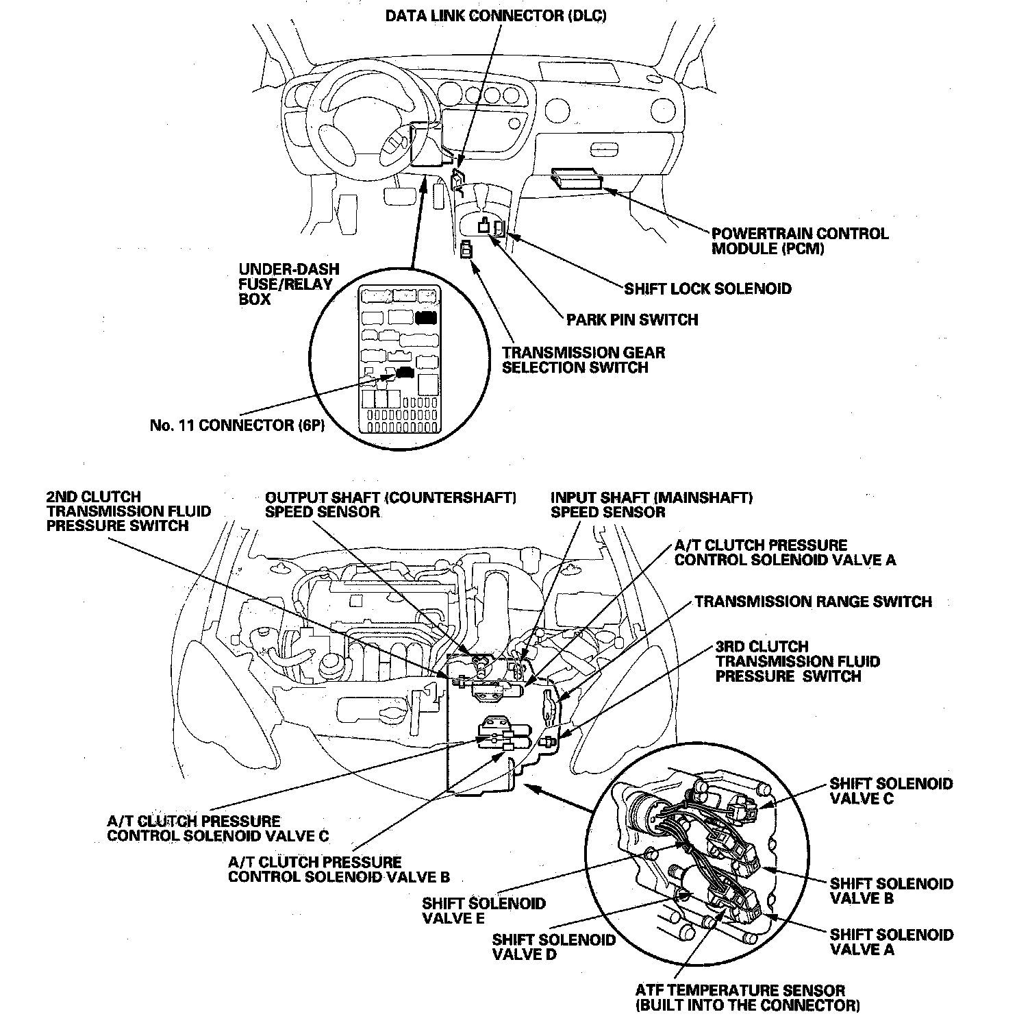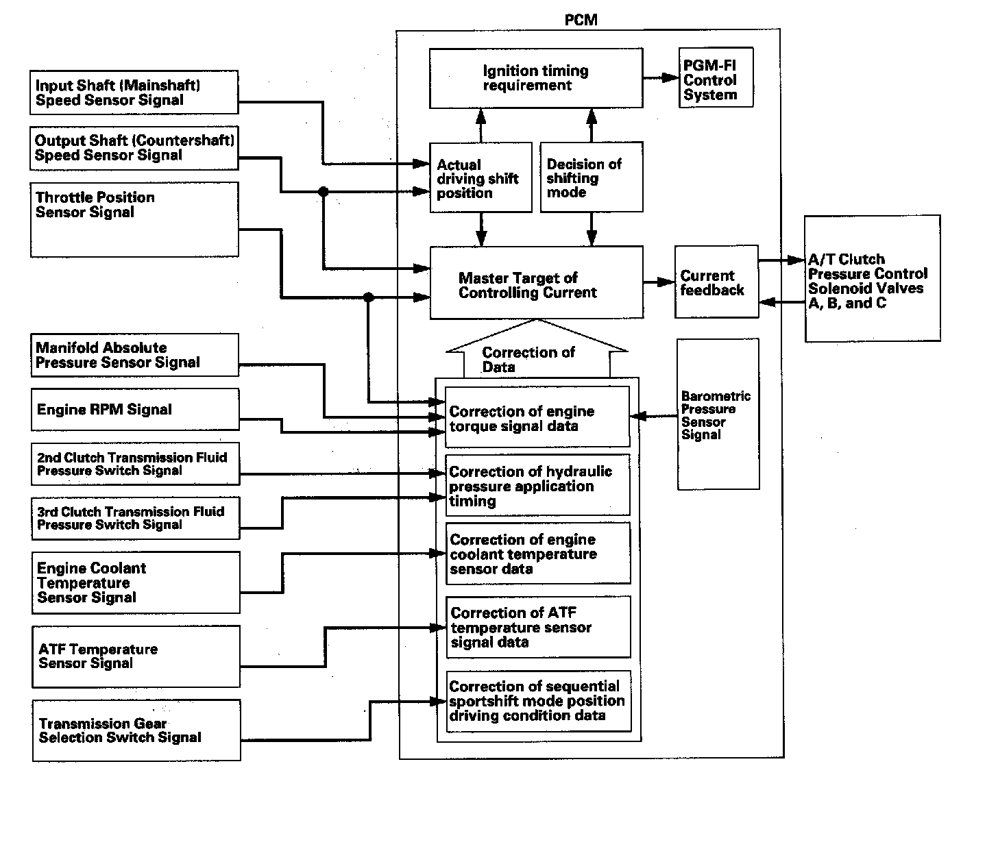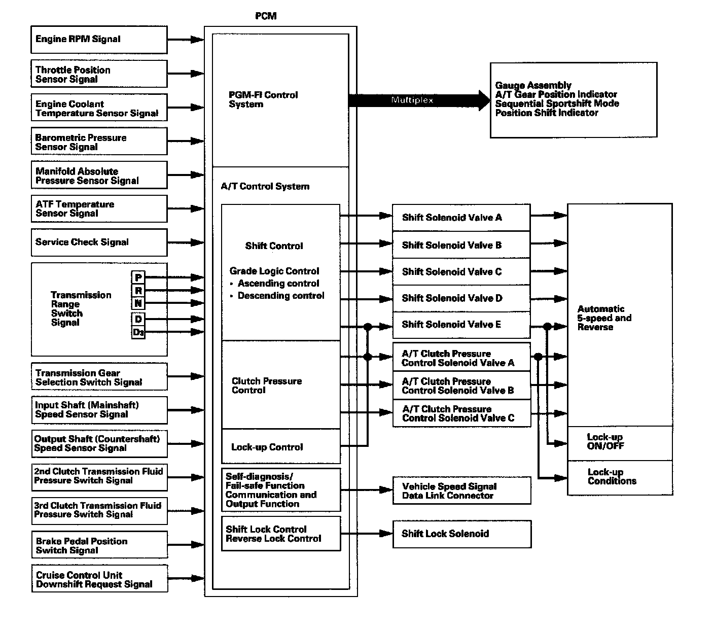 The PCM receives input signals from the sensors, switches, and other control units, perform processing data, and outputs signals for the engine control system and A/T control system. The A/T control system includes shift control, grade logic control, clutch pressure control, and lock-up control is stored in the PCM. The PCM switches the shift solenoid valves and the A/T clutch pressure control solenoid valves to control shifting transmission gears and lock-up torque converter clutch.
