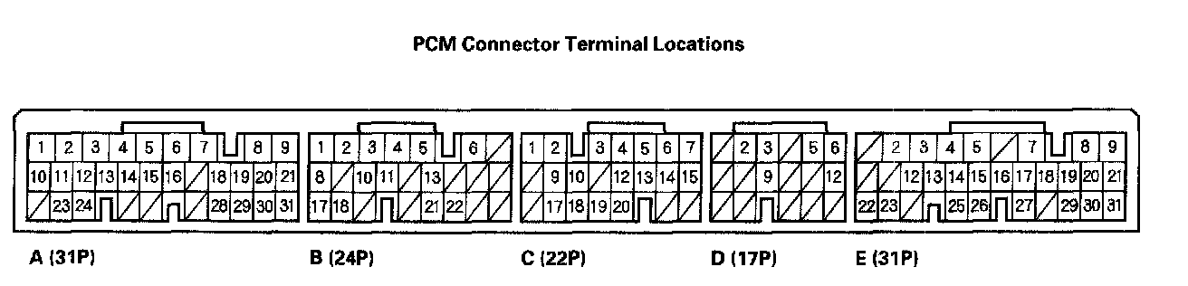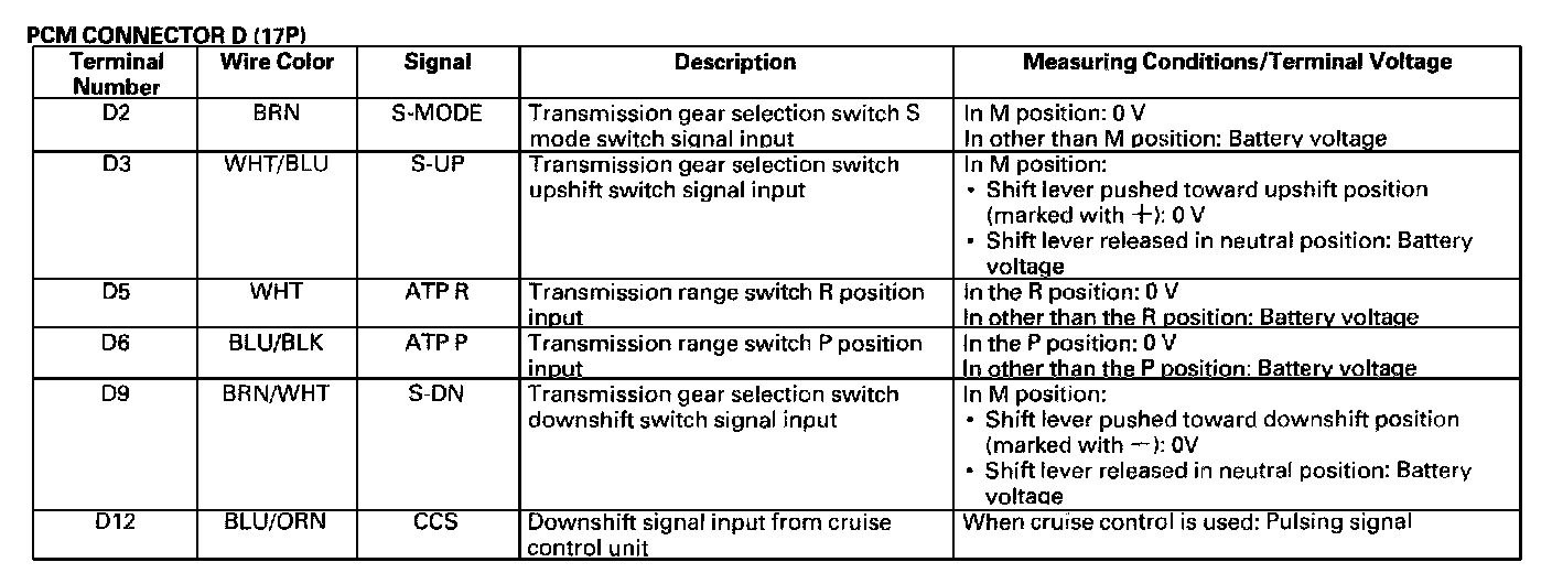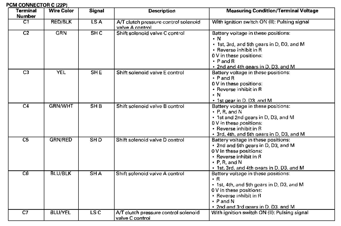 The PCM terminal voltage and measuring conditions are shown for the connector terminals that are related to the A/T control system. The other terminal voltage and measuring conditions are described in Fuel and Emission.