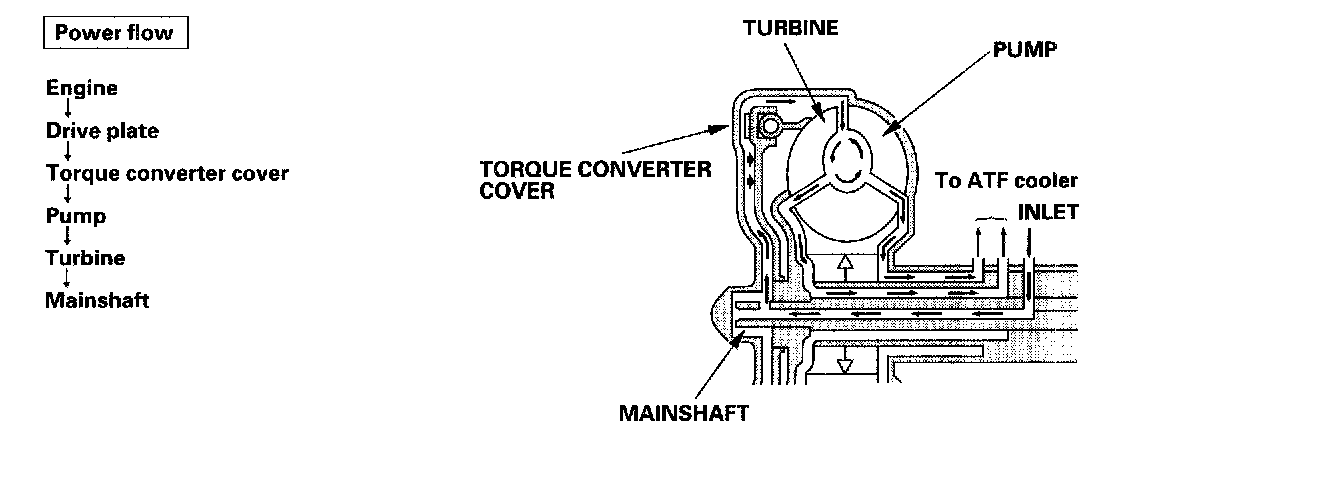 Fluid entering from the chamber between the torque converter cover and the torque converter clutch piston passes through the torque converter and goes out from the chambers between the turbine and the stator, and between the pump and the stator. As a result, the torque converter clutch piston moves away from the torque converter, and the torque converter clutch lock-up is released; torque converter clutch lock-up is OFF.