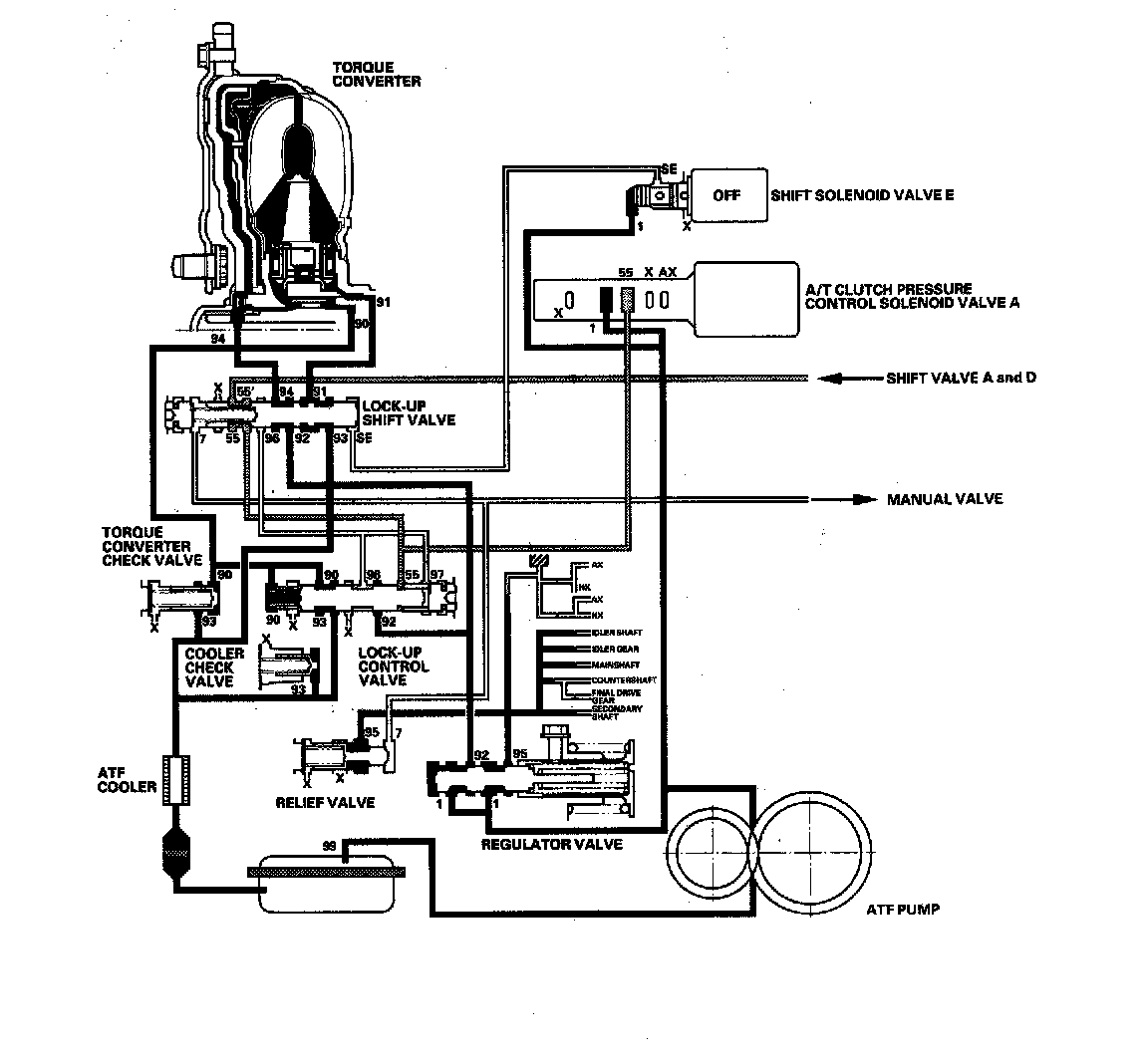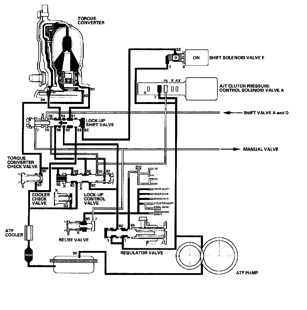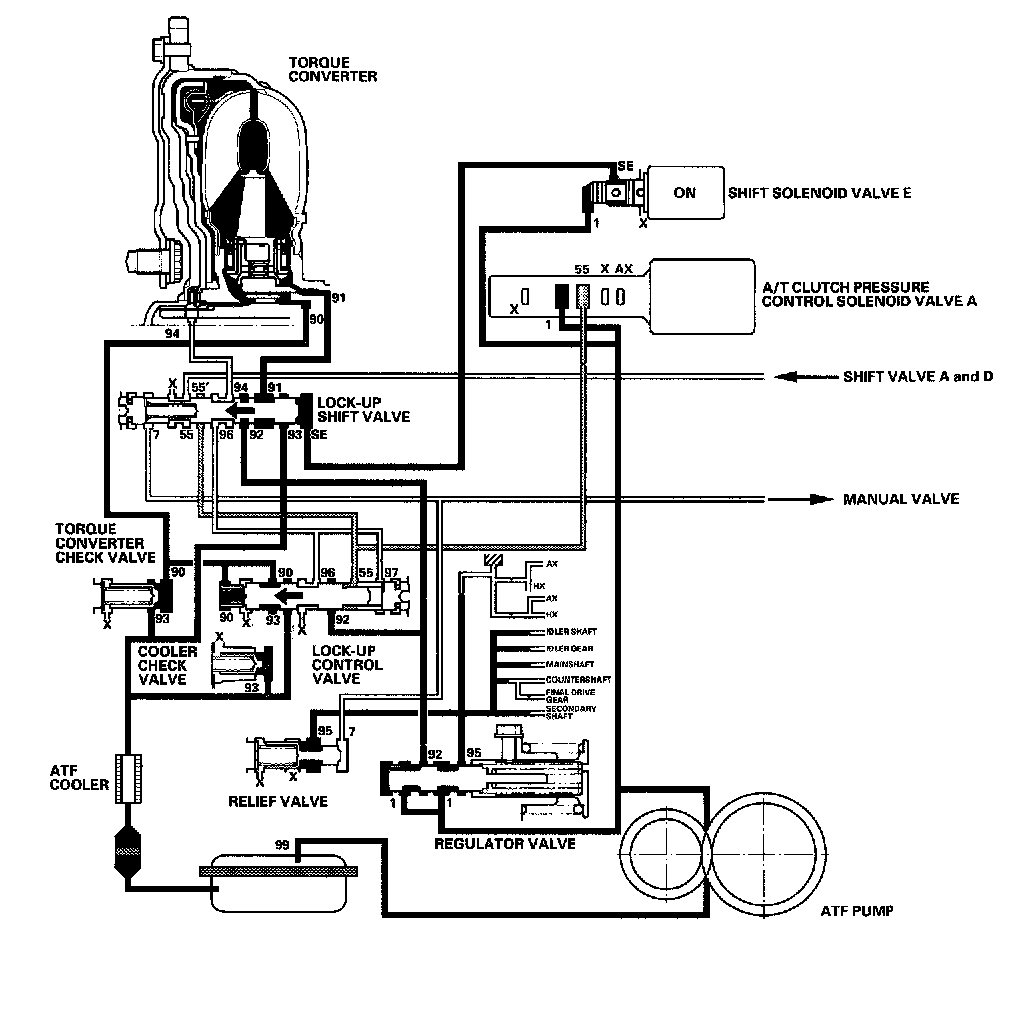 Shift solenoid valve E is turned OFF by the PCM, and shift solenoid valve E pressure (SE) is not applied to the lock-up shift valve. The lock-up Shift valve stays to the right to uncover the torque converter pressure ports leading to the left side of the torque converter and releasing pressure from the right side of the torque converter. Torque converter pressure (92) changes to (94) at the lock-up shift valve, and enters into the left side of the torque converter to disengage the torque converter clutch. This keeps the torque converter clutch piston keeps away from the torque converter cover and the torque converter clutch lock-up is OFF.