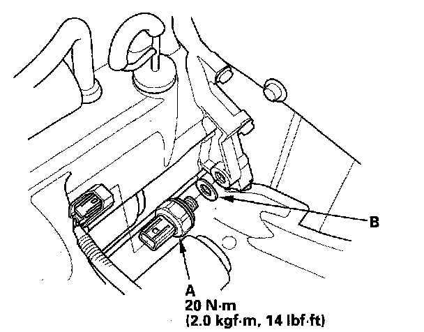 2. Remove the 3rd clutch transmission fluid pressure switch, then install a new one with a new sealing washer (B). Tighten the switch to the specified torque.