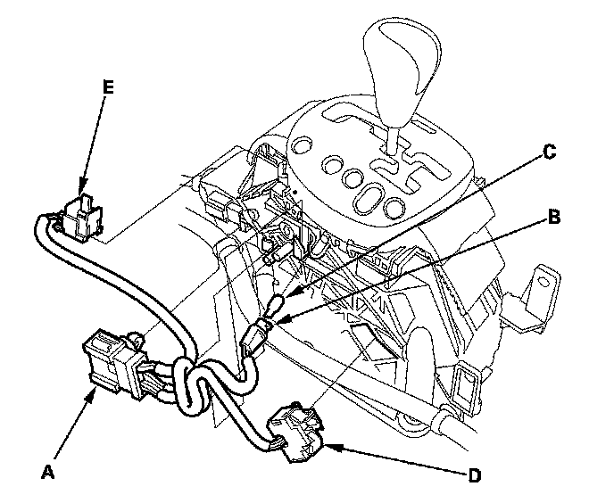 4. Remove the transmission gear selection switch (D) and park pin switch (E), and install the new switches and connector.