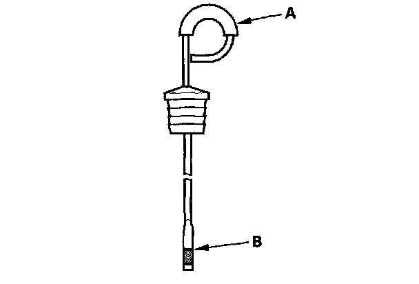 5. Remove the dipstick (A) and check the fluid level. It should be at upper mark (B).