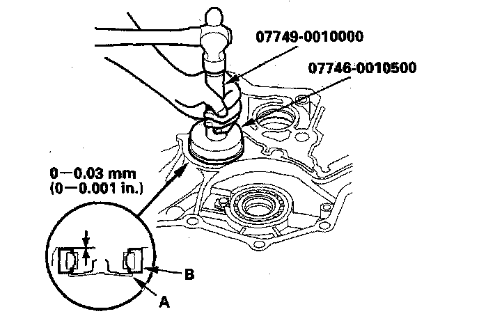 2. Install the new oil seal (A) in the torque converter housing in depth (B) of 0.5 - 1.5 mm (0.02 - 0.06 inch) below the housing surface with the special tools.