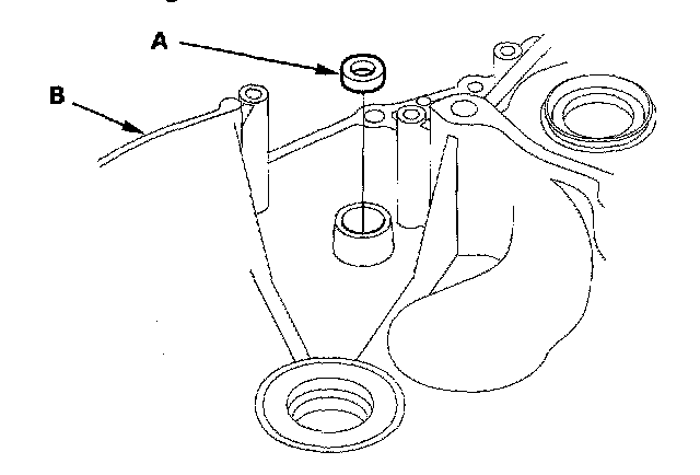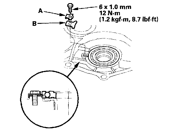 1. Remove the bolt, then remove the lock washer (A) and bearing set plate (B).