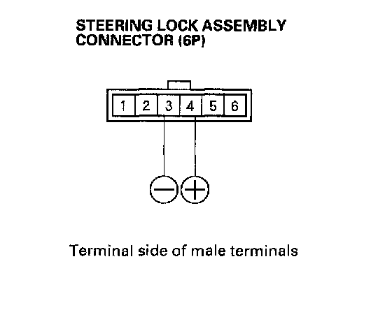 4. Connect the No. 4 terminal of the steering lock assembly connector (6P) to the battery positive terminal, and connect the No. 3 terminal to the battery negative terminal. Try to turn the ignition key to LOCK (0) and then remove from the key cylinder.