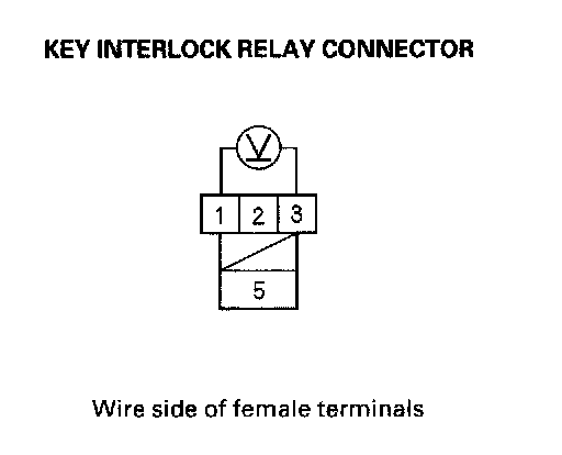 7. Measure the voltage between the No. 1 and No. 3 terminals of the key interlock relay connector.