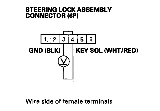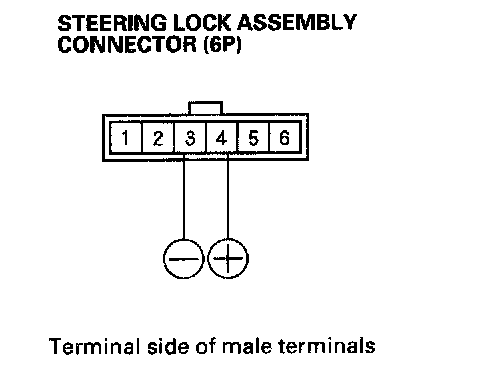 14. Turn the ignition switch ON (II), and measure the voltage between the No. 3 and No. 4 terminals of the steering lock assembly connector (6P).