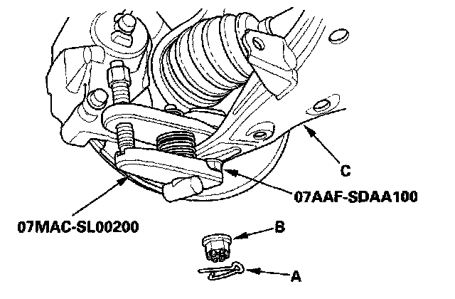 8. Separate the ball joint from the lower arm (C) with the special tool. Be careful not to dislodge the lower ball joint from the knuckle.