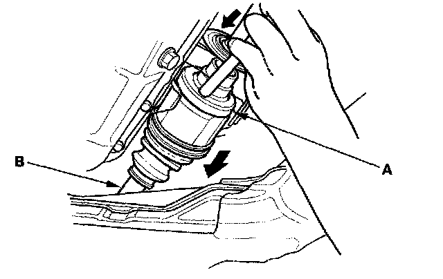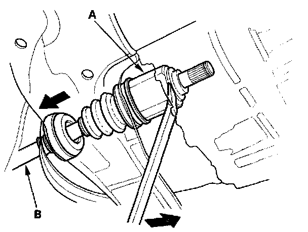 10. Pry/tap the inboard joint (A) with a prybar, and remove the driveshaft from the differential case or bearing support as an assembly. Do not pull on the driveshaft (B) because the inboard joint may come apart. Pull the driveshaft straight out to avoid damaging the differential oil seal.