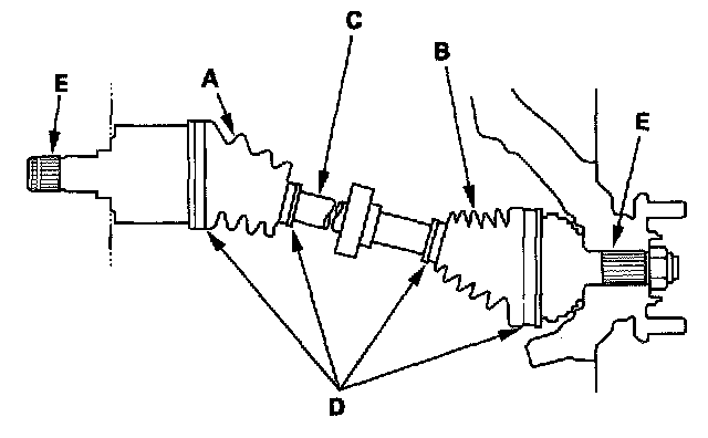1. Check the inboard boot (A) and the outboard boot (B) on the driveshaft (C) for cracks, damage, leaking grease, and loose boot bands (D). If any damage is found, replace the boot and boot bands.