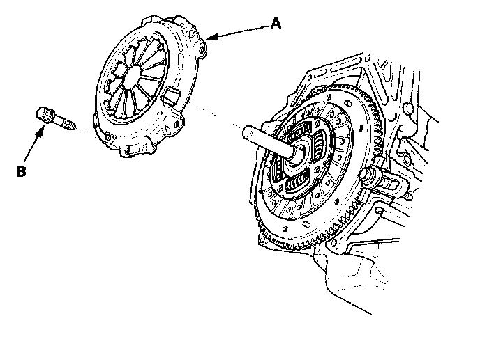 3. To prevent warping, unscrew the pressure plate mounting bolts (A) in a crisscross pattern in several steps, then remove the pressure plate (B).
