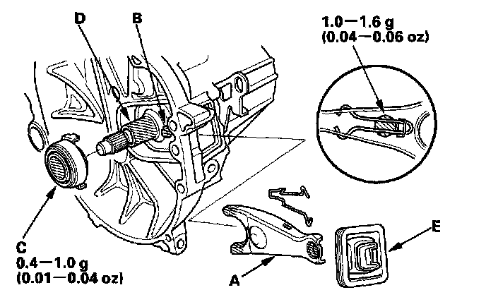2. Remove the release fork (C) from the clutch housing by squeezing the release fork set spring (D) with pliers. Remove the release bearing (E).