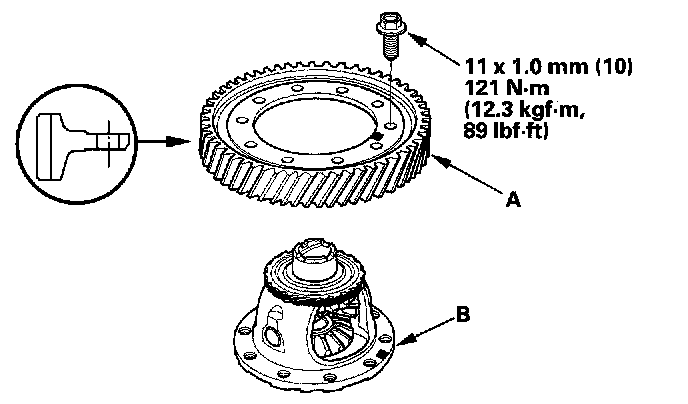 Differential Carrier, Final Driven Gear Replacement1. Remove the bolts (left-hand threads) in a crisscross pattern in several steps, then remove the final driven gear (A) from the differential carrier (B).