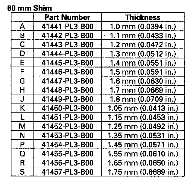 6. If the clearance is more than the standard, select a new shim from the following table. If the clearance measured in step 5 is within the standard, go to step 9.