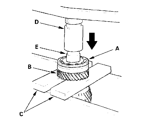 3. Support the ball bearing (A) (5-speed model) or 6th gear (B) (6-speed model) on steel blocks (C), then use a press (D) and an attachment (E) to press the countershaft out of the ball bearing.