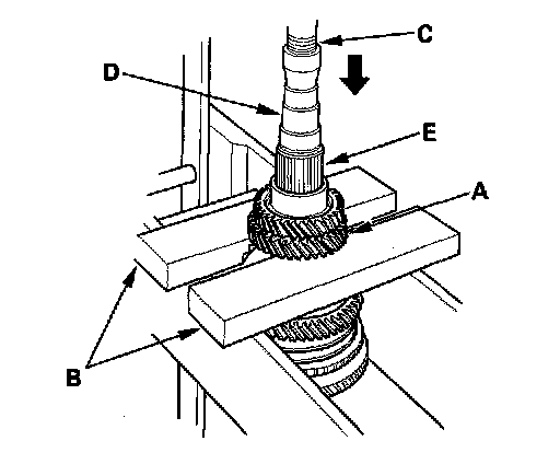 5. Support 4th gear (A) on steel blocks (B), then use a press (C) and an attachment (D) to press the countershaft (E) out of 5th gear.