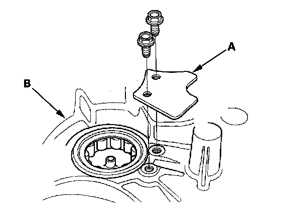 1. Remove the bearing set plate (A) from the clutch housing (B).